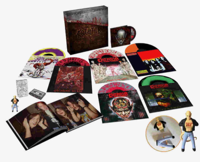KREATOR's "Under The Guillotine: The Noise Records Anthology" will be released on February 26, 2021 as a deluxe box set, 2CD and 2LP formats. The story of KREATOR's meteoric rise to the global elite of thrash metal bands from their humble beginnings in Essen, Germany, began under their first name of TORMENTOR in the early 1980s. It was their "Blitzkreig" and "End Of The World" demos changing hands in the era's bustling underground tape-trading network that exposed them to the international metal community. Positive word of mouth soon attracted the attention of Germany's own metal start-up Noise Records, which signed the newly re-christened KREATOR to a deal. KREATOR's tenure at the label spawned six studio albums and established them as one of the most influential on the thrash scene, one they dominate to this day. 1985 debut "Endless Pain" was savage; its crude thrashing quickly had the underground metal world abuzz with excitement. 1986's follow-up "Pleasure To Kill" is considered the band's first "classic" album and raised the bar with more diversity of tempos, while losing nothing in terms of ferocity or speed. 1987's "Terrible Certainty" further cemented the reputation that KREATOR were one of the genre's finest exponents. In 1989, the band closed the decade with the thrash triumph of "Extreme Aggression", their biggest seller to date. 1990's huge magnum opus "Coma Of Souls" confirmed them in thrash history before they diversified their sound on the experimental "Renewal" in 1992. "Under The Guillotine" is a deluxe celebration of KREATOR's Noise Records discography and is the definitive collection of their first decade of recorded work. It contains: * "Endless Pain" (Swirl vinyl with original artwork & inner sleeve) * "Pleasure To Kill" (Splatter vinyl with original artwork & inner sleeve) * "Terrible Certainty" (Splatter vinyl with original artwork & inner lyric sleeve) * "Extreme Aggression" (Half/half vinyl with original artwork & inner lyric sleeve) * "Coma Of Souls" (Splatter vinyl with original artwork & inner lyric sleeve) * "Renewal" (Swirl vinyl with original artwork & inner lyric sleeve) * "Some Pain Will Last" DVD containing "From The Vault" mini documentary, plus two previously unreleased audio live concerts and an Andy Sneap remix of "Live In East Berlin 1990" * 12" x 12" 40-page hardback book of photography, quotes and lyrics from the first decade of the band's existence. Contains rare and previously unseen photos from the era. * Reproduction "End Of The World" demo cassette * "Demon" figurine USB drive containing MP3 audio of all the expanded editions of all the albums. * All encased in an executioners, guillotine box. * The first 250 orders from the Noise Records store will also receive a signed art card by Mille Petrozza. Also available as an introduction piece is "Under The Guillotine - The Noise Anthology" — an 18-track double-vinyl collection of KREATOR's Noise-era classics, pressed on splatter vinyl, including rare and unseen photos. And for the non-vinyl collectors, there will also be a 30-track 2CD version, housed in a mediabook. Both feature rare tracks and remixes from the band's discography.