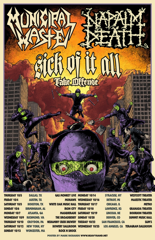 Richmond, Virginia's MUNICIPAL WASTE will team up with U.K. grindcore band NAPALM DEATH for a co-headlining U.S. tour. The 17-date trek will kick off in Dallas on October 3 and visit New York, Chicago and Denver before ending on October 23 in Los Angeles. Opening the night are New York hardcore legends SICK OF IT ALL and hardcore punk/thrash metal band TAKE OFFENSE. MUNICIPAL WASTE's Tony Foresta comments: "Ohhh, I'm exhausted. I've been on this street a thousand times. It's never looked so strange. The faces...so cold. In the distance, a child is crying. Fatherless...a bastard child, perhaps. My back aches...my heart aches...but my feet (stops to look at feet)... my feet are resilient! Thank God I took off my heels, and put on my... HIMALAYAN WALKING SHOES! Also this tour is going to rule. Yes!" Tour dates: Oct. 03 - Dallas, TX - Gas Monkey Live* Oct. 04 - Austin, TX - Mohawk* Oct. 05 - Houston, TX - White Oak Music Hall* Oct. 06 - Birmingham, AL - Iron City Oct. 07 - Atlanta, GA - Masquerade* Oct. 09 - Richmond, VA - The Broadberry Oct. 10 - Croydon, PA - Neshaminy Creek Brewery Oct. 12 - New York, NY - Bowery Ballroom # Oct. 13 - Worcester, MA - Rock N Shock Festival Oct. 14 - Syracuse, NY - Westcott Theater Oct. 16 - Detroit, MI - Majestic Theater Oct. 17 - Chicago, IL - Metro Friday Oct. 18 - Lawrence, KS - Granada Theater Oct. 19 - Lincoln, NE - Bourbon Theater Oct. 20 - Denver, CO - Summit Music Hall Oct. 22 - San Francisco, CA - Slim's Oct. 23 - Los Angeles, CA - Teragram Ballroom % * plus REVOCATION, VOIVOD, PSYCROPTIC, SKELETAL REMAINS, CONJURER # plus DROPDEAD % plus EVILDEAD MUNICIPAL WASTE's sixth studio album, "Slime And Punishment", was released in 2017 via Nuclear Blast. The disc was the first WASTE album to be engineered by bassist Phil "Landphil" Hall at Blaze Of Torment Studios in Richmond, Virginia. Mixing and mastering was completed by Bill Metoyer (SLAYER, W.A.S.P., LIZZY BORDEN and DARK ANGEL) in Hollywood, California. The cover artwork for "Slime And Punishment" was created by the band's good friend, Andrei Bouzikov. This was the fourth cover he created for them as he was responsible for the art for "Massive Aggressive", "The Art Of Partying" and the split with TOXIC HOLOCAUST, "Toxic Waste". NAPALM DEATH's long-awaited new album will not be released before next year. The follow-up to the 2015's "Apex Predator - Easy Meat" will feature an appearance by guitarist Mitch Harris, who has been taking a leave of absence from NAPALM DEATH since late 2014 to focus on his family life. Last summer, NAPALM DEATH supported SLAYER on the second U.S. leg of the latter band's final world tour. The 20-date trek featured additional support from LAMB OF GOD, ANTHRAX and TESTAMENT.