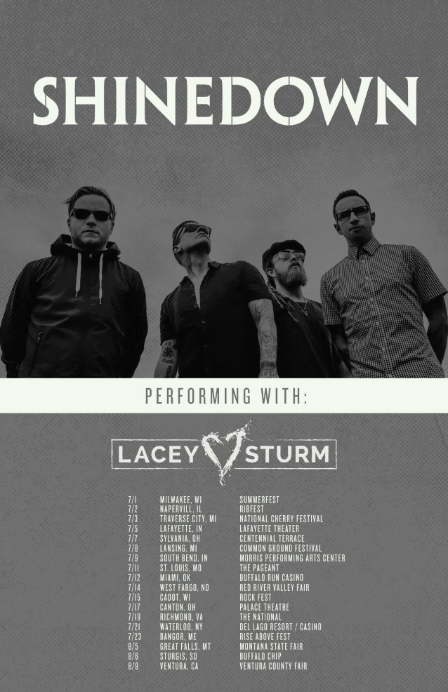 SHINEDOWN will hit the road in July with support from former FLYLEAF singer Lacey Sturm. The dates are as follows: Jul. 01 - Milwaukee, WI - Summerfest Jul. 02 - Naperville, IL - Ribfest Jul. 03 - Traverse City, MI - National Cherry Festival Jul. 05 - Lafayette, IN - Lafayette Theater Jul. 07 - Toledo, OH - Centennial Terrace Jul. 08 - Lansing, MI - Common Ground Festival Jul. 09 - South Bend, IN - Morris Performing Arts Center Jul. 11 - St. Louis, MO - The Pageant Jul. 12 - Miami, OK - Buffalo Run Casino Jul. 14 - West Fargo, ND - Red River Valley Fair Jul. 15 - Cadott, WI - Rock Fest Jul. 17 - Canton, OH - Canton Palace Theatre Jul. 19 - Richmond, VA - The National Jul. 21 - Waterloo, NY - Del Lago Resort/Casino Jul. 23 - Bangor, ME - Rise Above Festival Aug. 05 - Great Falls, MT - Montana State Fair Aug. 06 - Sturgis, SD - Buffalo Chip Aug. 09 - Ventura, CA - Ventura County Fair SHINEDOWN's "How Did You Love" in February moved into the No. 1 position on Billboard's Mainstream Rock Songs airplay chart, marking the eleventh time the Florida rockers had topped the list. "How Did You Love" is the fourth single from SHINEDOWN's fifth studio album, "Threat To Survival", and the third No. 1 from the disc. Previous chart-topping singles from "Threat" were "Cut The Cord" and "State Of My Head". As previously reported, SHINEDOWN has officially started working on its sixth studio album and frontman Brent Smith said that the project may take a surprising turn. He explained: "Bassist Eric Bass actually has 22 pieces that I actually just heard five of them for the very first time." He added, "What he has written — and it's not lip service, man — what he has tapped into here, it's quite remarkable. I think people might be looking at the first legitimate concept record from the band." Asked whether SHINEDOWN could end up with a 22-song double album, Smith replied: "I can't guarantee that all of the song ideas will make the record. 'Cause we haven't done that in a while, where I come in and I actually have a lot of music already ready for me to listen to… It's inspiring. And it's cool, because [Eric] was inspired every day, and you can hear it in the music." SHINEDOWN is currently touring Europe as the support act for IRON MAIDEN. Sturm's debut solo album, "Life Screams", was released in February 2016 via Followspot Records with The Fuel Music distribution. Writing alone, as well as with husband/guitarist Josh Sturm, SKILLET's Korey Cooper and Grammy Award-winning writer and producer David Hodges, Lacey created a record that is the sonic successor to FLYLEAF's celebrated self-titled debut (which spent a staggering 133 weeks on The Billboard 200 chart).