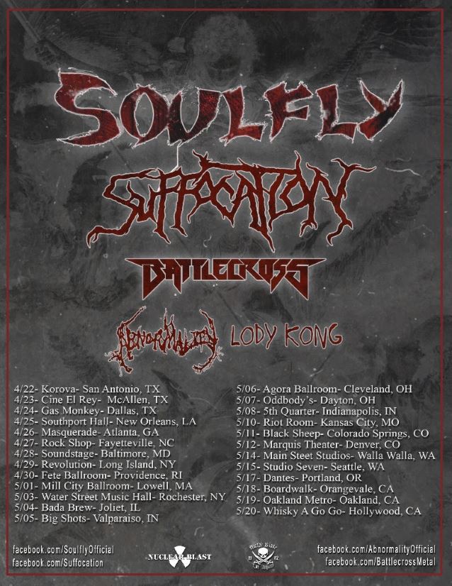 SOULFLY will embark on a four-week U.S. headlining tour in April. Joining them on the trek will be brutal death metal legends SUFFOCATION, Metal Blade recording artists BATTLECROSS, as well as ABORMALITY and LODY KONG. Comments SOULFLY mailman Max Cavalera: "We are coming again with another kick-in-your-face package! Get ready to sell your soul to metal!!" SOULFLY, SUFFOCATION, BATTLECROSS, ABNORMALITY, LODY KONG tour dates: Apr. 22 - San Antonio, TX - Korova Apr. 23 - McAllen, TX Cine - El Rey Apr. 24 - Dallas, TX - Gas Monkey* Apr. 25 - New Orleans, LA - Southport Hall Apr. 26 - Atlanta, GA - Masquerade Apr. 27 - Fayetteville, NC - Rock Shop Apr. 28 - Baltimore, MD - Soundstage Apr. 29 - Long Island, NY - Revolution Apr. 30 - Providence, RI - Fete Ballroom May 01 - Lowell, MA - Mill City Ballroom May 03 - Rochester, NY - Water Street Music Hall May 04 - Joliet, IL - Bada Brew May 05 - Valparaiso, IN - Big Shots May 06 - Cleveland, OH - Agora Ballroom May 07 - Dayton, OH - Oddbody's May 08 - Indianapolis, IN - 5th Quarter May 10 - Kansas City, MO - Riot Room May 11 - Colorado Springs, CO - Black Sheep May 12 - Denver, CO - Marquis Theater May 14 - Walla Walla, WA - Main Street Studios May 15 - Seattle, WA - Studio Seven May 17 - Portland, OR - Dantes May 18 - Orangevale, CA - Boardwalk May 19 - Oakland, CA - Oakland Metro May 20 - West Hollywood, CA - Whisky A Go Go * No SUFFOCATION SOULFLY's tenth studio album, "Archangel", was released on August 14, 2015 via Nuclear Blast Entertainment. The CD was produced and mixed by Matt Hyde (SLAYER, BEHEMOTH, CHILDREN OF BODOM), and features cover artwork by artist Eliran Kantor (TESTAMENT, HATEBREED, ICED EARTH, SODOM). SOULFLY has tapped Mike Leon (HAVOK) to play bass on the band's current tour. Leon said: "I've been a fan of Max [Cavalera, SOULFLY mainman] and his music since I was a little kid, and to be playing with him and the guys now is truly unbelievable!" Handling bass duties for SOULFLY during some of the group's shows last year was Max Cavalera's son Igor, who also sings for the Phoenix, Arizona band LODY KONG. Former STATIC-X bassist Tony Campos left SOULFLY in May 2015 and is now touring with FEAR FACTORY. Speaking to United Rock Nations about "Archangel", Max said: "I have not been excited for a SOULFLY record like 'Archangel' for ten years. It sounds really exciting, and I am excited. I worked with a great producer, Matt Hyde, and he understood what I wanted to do: this, kind of, exotic, mystic, biblical kind of record. And he helped me get through, and we did a lot of cool stuff together with the vocals; there's a lot of chanting and things I've never done before with my voice. It still sounds like Max, but there's a different feeling to it. And there's some trademarks on it. Like the first song's called 'We Sold Our Souls To Metal', it's a pure metal anthem. It's a great song — a declaration of proudness of being metal, and live metal, live the metal life. So it's, for me, my most honest way to tell the fans that I'm proud to be metal and I sold my soul to metal, so you should [sell] your soul to metal as well. It's a cool song… I don't know… I like the album artwork. Eliran did it. And I really like the colors. [There's] a bit [of the] Middle East [influence] in the guitar. There's some riffs that are very Middle Eastern riffs and kind of Babylonian riffs. So it's pretty cool. That's from me listening to MELECHESH and BEHEMOTH and stuff like that."