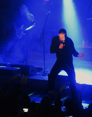 At just after 9 or a few minutes after the lights went down and the excitement from down below reached fever pitch as the Symphony X guys took their positions as the Overture intro played over the PA before the band tore into pounding opener Nevermore. I didn't know it at the time as the song was blaring it out but the band is touring Underworld and they would go on to play it in it's entirety but not in CD order as Russell explained later. Anyhow Underworld sounded bloody amazing from my vantage point, second row on the balcony. Russell's look is a bit hardman nu-metal with his wrap around shades and slicked back hair but it doesn't detract from his singing at all.